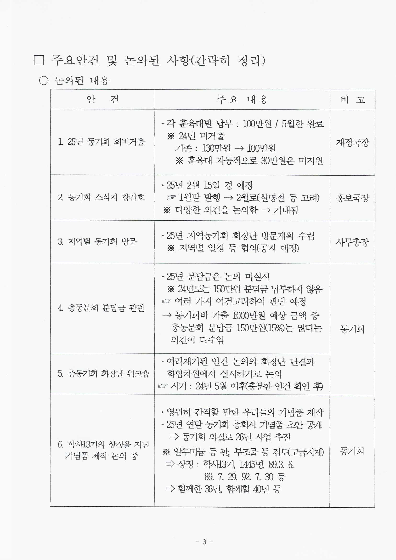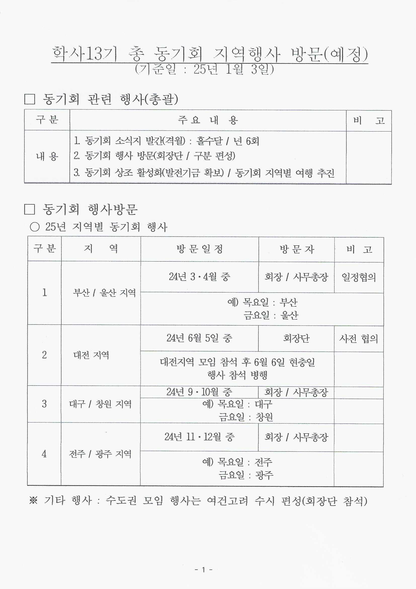 이날 홀수달과 짝수달을 구분해 각 지역별 방문 일정과 동기회 소식지를 격월마다 발행해 알리기, 여름철 즈음에 임원 워크샵, 지역 방문시 기념품 준비 등 다양하게 회의를 진행했다.